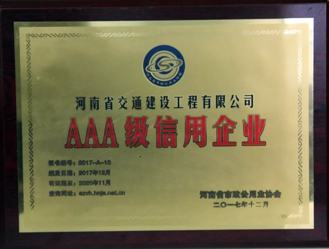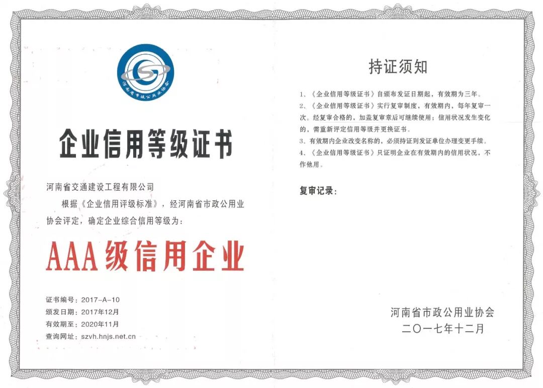 近日,河南省市政公用业协会公布了2017年信用等级企业榜单,河南交建公司荣获“AAA级信用企业”及“河南省市政公用工程施工安全管理先进企业”两项省级奖项。