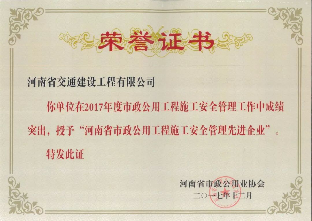 2017年,河南交建公司严格按照规范和标准狠抓施工现场安全管理工作,同时,在全员牢固树立安全第一、预防为主的思想观念,被河南省市政公用业协会认可,取得“河南省市政公用工程施工安全管理先进企业”荣誉称号。